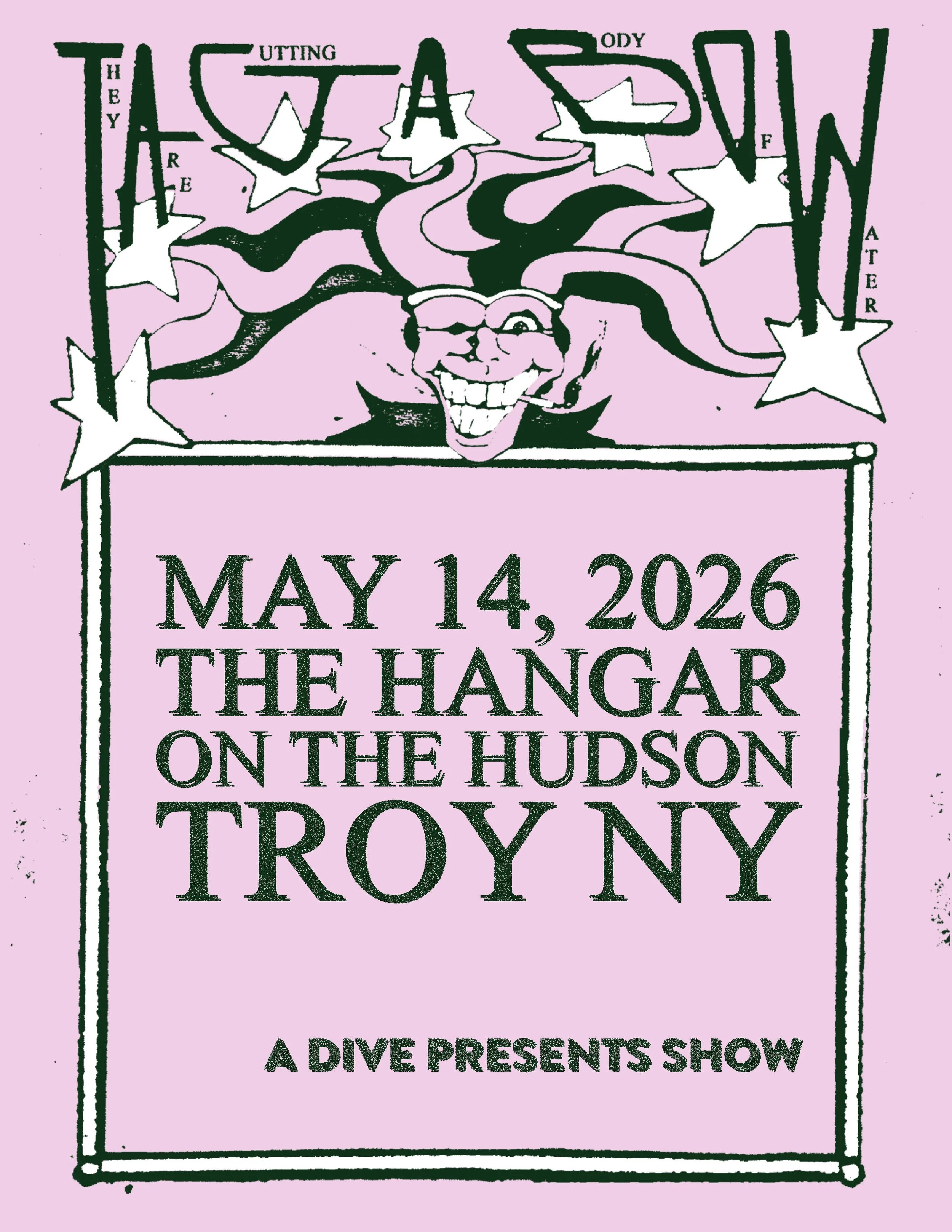 Dive Presents They Are Gutting a Body of Water Thursday, May 14, 2026 7:00 PM 10:00 PM 19:00 22:00 The Hangar on the Hudson 675 River Street Troy, NY, 12180 United States (map) Google Calendar ICS 7 PM doors 8 PM show$20 ADV / $25 DOS Tickets